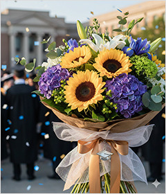 얼기설기 만든 꽃다발을 든 졸업생들이