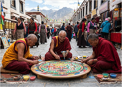 스님들이 색색의 모래로 정교한 그림을 만들고 있었습니다.